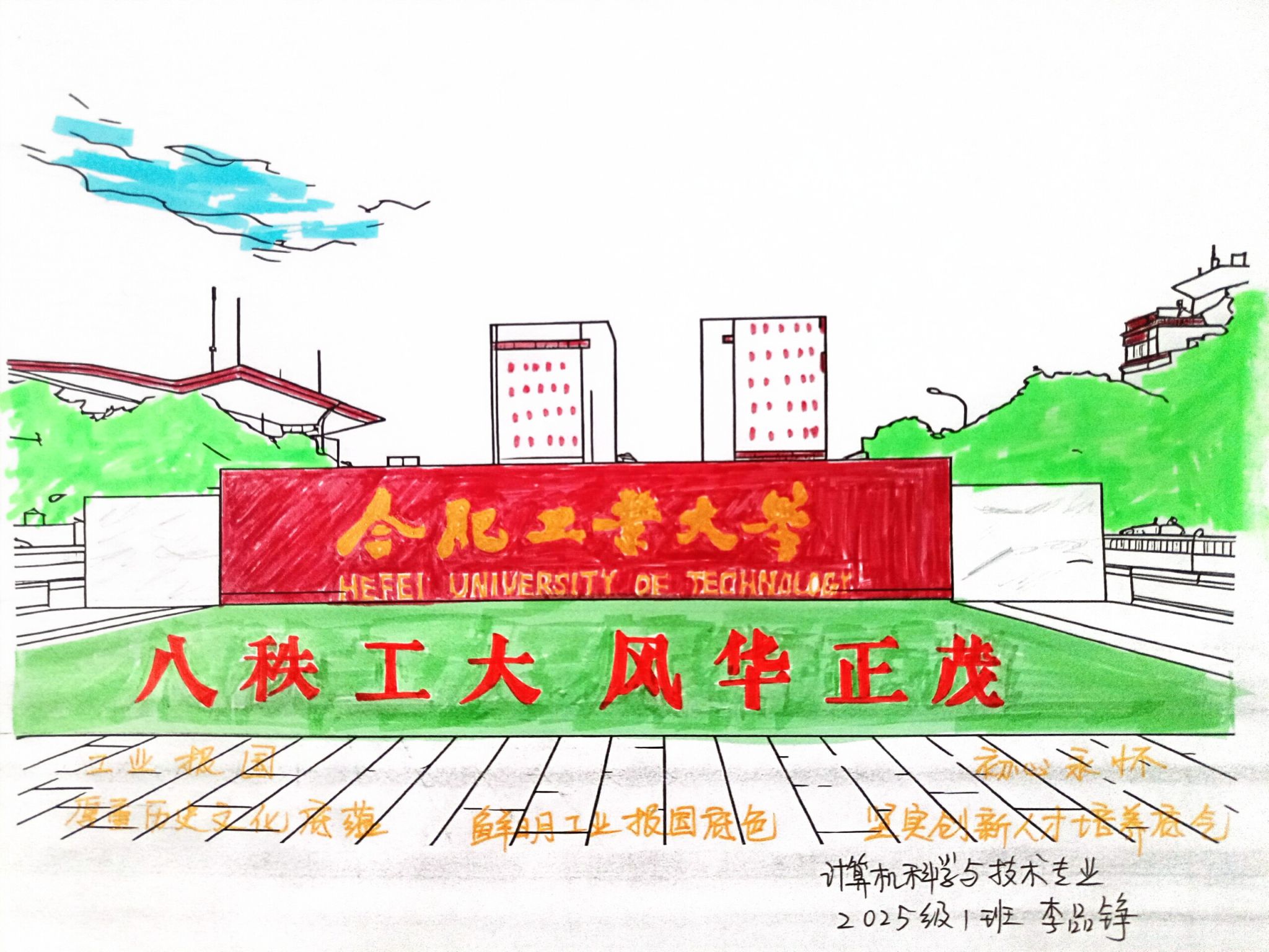 本次活动设置绘画、征文、短视频三大板块,吸引全院学子踊跃参与,同学们或用笔墨勾勒山河与校园风华,或用文字礼赞祖国成就与母校征程,或用镜头记录与国旗、校园地标的同框瞬间,累计收到各类作品55件。活动结束后,学院综合事务部为保障评选公正性,组建评审小组,通过作品主题契合度、创意表现、制作质量等维度开展公平公开评选,最终筛选出的优秀作品已通过学院官方公众号、“小喇叭”进行展示,所有参与并符合要求的同学均获计入第二课堂成绩单,以多元创意为祖国与母校献上青春告白。