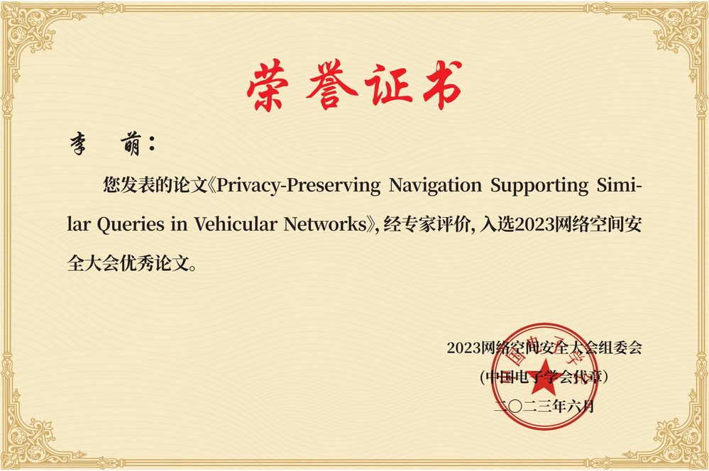 On June 2, 2023, the 2023 Network Cybersecurity Conference officially released the excellent papers on network cybersecurity, with ten journal papers and ten conference papers selected. The paper "Privacy-Preserving Navigation Supporting Similar Queries in Vehicular Networks" by Associate Researcher Li Meng from our school's UbiP research group was honored to be selected!