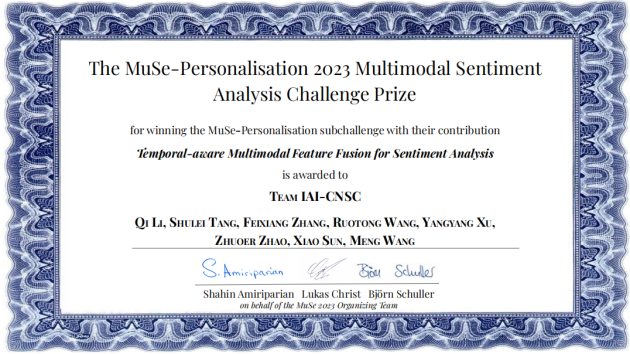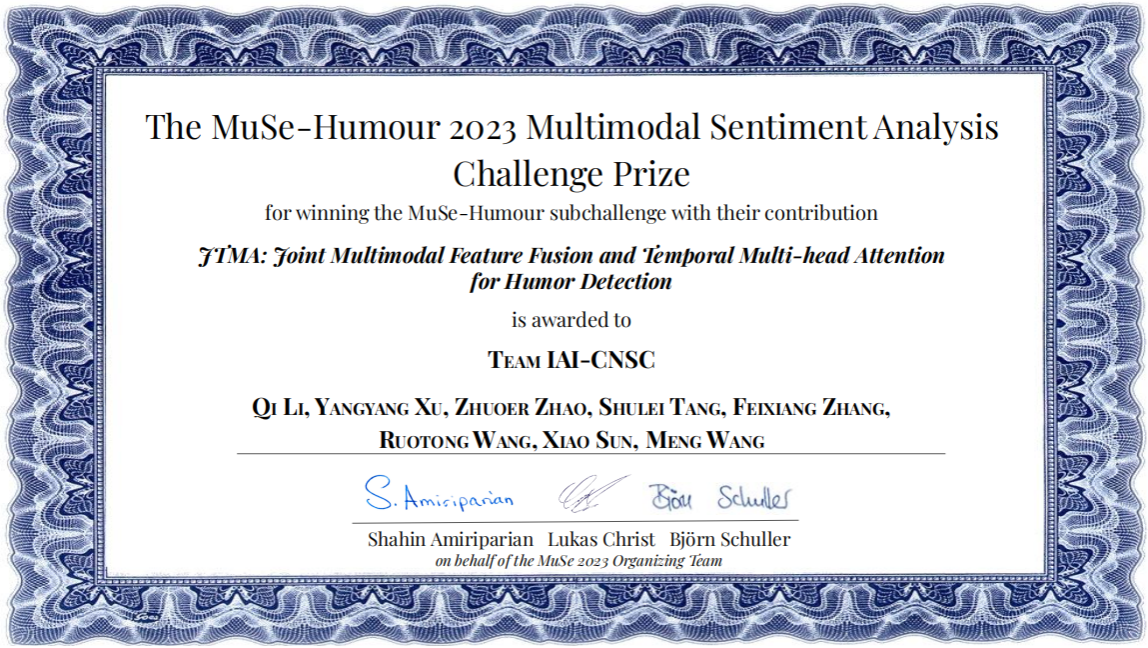 The International Multimodal Emotion Analysis Challenge is the fourth challenge hosted by the ACM Multimedia Conference, co-sponsored by Imperial College London, University of Augsburg in Germany, and Nanyang Technological University, among others. It is reported that in 2023, 31 teams from 25 research institutions in 8 countries around the world participated, including top teams in the field from the Institute of Automation of the Chinese Academy of Sciences, University of New South Wales, Ghent University, University of Chinese Academy of Sciences, SenseTime Research Institute, iFLYTEK, and Ximalaya. This year's Multimodal Emotion Analysis Challenge is divided into three tracks: Humor Detection, Imitation Emotion Recognition, and Personalized Emotion Analysis. The competition focuses on multimodal high-robust compound emotion analysis in natural scenes, emphasizing the evaluation of multimodal deep fusion capabilities combined with semantic information. Participants need to effectively predict psychological indicators such as humor, emotion analysis, and emotional reactions based on different datasets provided by the official for different challenge content, including audio and video data in natural scenes, text data, and physiological signal data.