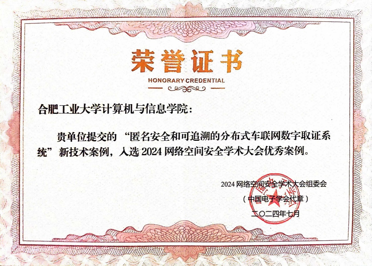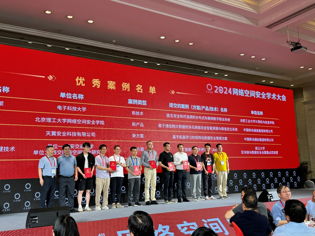 On July 13, 2024, during the "2024 Cyberspace Security Academic Conference," the excellent cases in the field of cyberspace security were officially announced. The work "Anonymous Security and Traceable Distributed Vehicular Network Digital Forensics System" by Associate Researcher Li Meng's research group from our institute was selected as an outstanding case (new technology) in cyberspace security for 2024 by the Chinese Institute of Electronics! Additionally, the scientific research achievement "Blockchain Consensus Optimization Technology Set," co-authored by Teacher Li Meng and the School of Cyberspace Security at Beijing Institute of Technology, also made the list!
