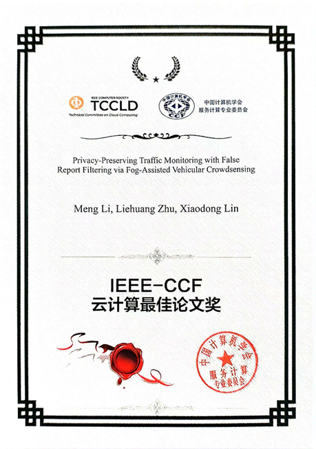 In recent years, the Ubiquitous Privacy Lab, led by Associate Professor Li Meng from our school, has conducted in-depth research on data security and privacy protection in the fields of vehicular networks and cloud computing, achieving a series of research outcomes. One of these outcomes, titled "Privacy-Preserving Traffic Monitoring with False Report Filtering via Fog-assisted Vehicular Crowdsensing," was published in the CCF A-recommended journal IEEE TSC (IEEE Transactions on Services Computing) and was awarded the IEEE-CCF Cloud Computing Best Paper Award on September 13, 2024. This research outcome was a collaboration with Beijing Institute of Technology and the University of Guelph, leveraging cryptography, cloud computing, and edge computing to address the challenge of securely filtering false traffic information in vehicular network traffic monitoring scenarios.