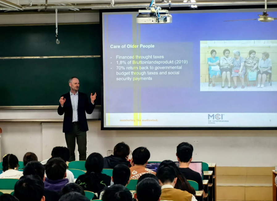 The Management Center Innsbruck (MCI) holds a prominent position in the European higher education system. This teaching activity represents an important step in our school 's efforts to internationalize education. It also strengthens the cooperation between Chinese and Austrian universities and advances educational and technological exchanges in the field of smart elderly care.
