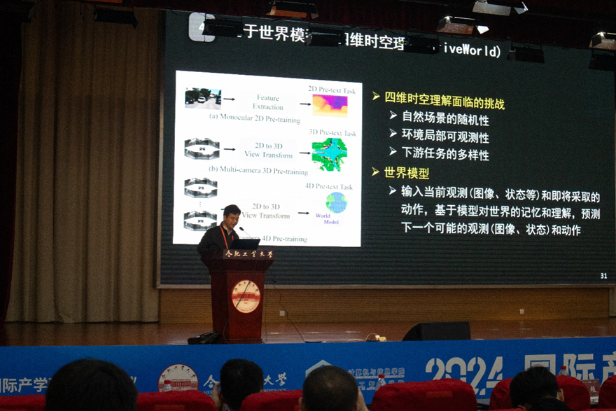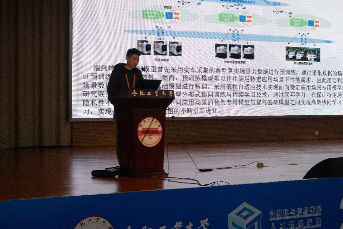 The Autonomous Driving Forum of the 2024 International Industry-Academia-Research-Application Cooperation Conference on New Energy and Intelligent Connected Vehicles was successfully held on November 9 at the Feicui Lake campus of Hefei University of Technology. The seminar, jointly organized by Hefei University of Technology, JAC Group, and the Anhui Artificial Intelligence Society, was themed "Empowering New Energy with Industry-Academia-Research-Application Cooperation, Creating a Future through Multilateral Collaboration." The event focused on key issues such as basic research, practical applications, autonomous driving, intelligent connectivity systems and applications, innovation in new energy technologies, smart transportation, intelligent equipment, and frontier technologies in intelligent system control. The Autonomous Driving Forum was hosted by the School of Computer Science and Information Engineering at Hefei University of Technology.