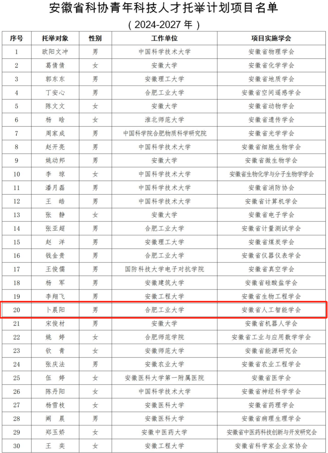 The Anhui Provincial AST Young Scientific Talent Support Program leverages the expertise and resources of academic societies and specialists to fully support the growth of young scientific talents. The program is highly competitive, with strict selection criteria. It is organized by provincial academic societies, with each society allowed to recommend only two candidates. After expert review, a decision meeting, and public announcement, 30 outstanding young scientific workers were selected and granted funding to achieve remarkable accomplishments during their innovation golden period.