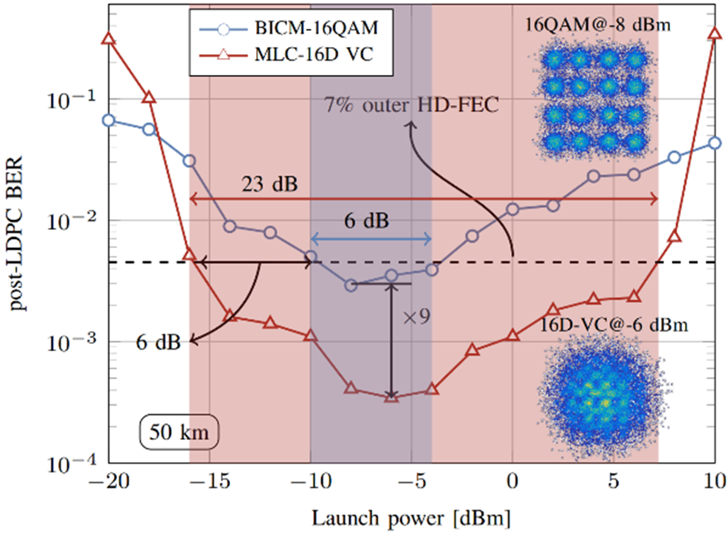 Multi-core optical fibers, the "superhighway" of the optical communication world, are ushering us into a new era of information transmission. Recent research by our faculty and students has revealed that a 16D Voronoi Constellation (MLC-16D VC) can enable signals to travel faster and farther on this "highway". In a 50-kilometer experiment with four-core optical fibers, this technology not only overcomes inter-core signal-to-noise ratio disparities but also delivers a 6dB gain in optical power sensitivity, significantly boosting transmission efficiency. Come and witness the "speed and passion" of optical fiber communication.