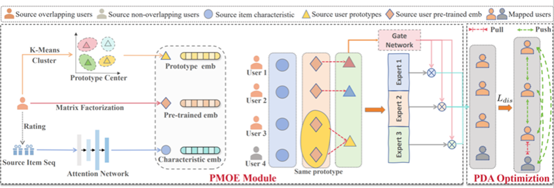 Fig. 2: An Illustration of our proposed MACDR framework, which consists of Prototype enhanced Mixture-Of Experts (PMOE) mapping module and Preference Distribution Alignment (PDA) optimization strategy. The PMOE module provides a flexible mapping function that combines the patterns of common and personalized preference transfer based onuser prototypes. The PDA optimization strategy utilizes non-overlapping users to boost recommendation performance in an unsupervised manner