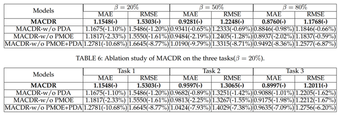 TABLE 2: Ablation study of MACDR on the Sports-Clothing dataset(task1). ”MACDR-w/o PDA” denotes removing the PDA optimization of MACDR. ”MACDR-w/o PMOE” denotes using a linear mapping function instead of PMOE for MACDR. ”MACDR-w/o PMOE+PDA” denotes removing PDA and PMOE modules