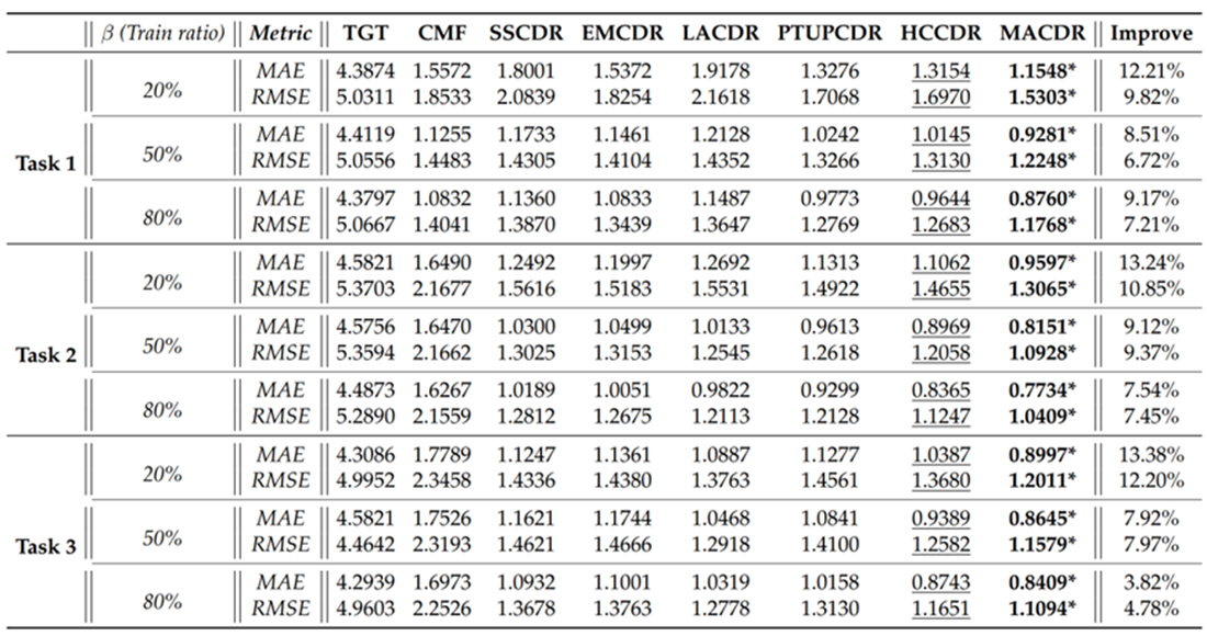 TABLE 1: Recommendation performance of our proposed MACDR and other baselines. For MAE and RMSE metrics, the lower value denotes better performances. The best results are in boldface and the second-best results are in underline. ∗indicates 0.05 level, paired t-test of MACDR (Ours) vs. the best baselines. Improve denotes relative improvement over the best baseline