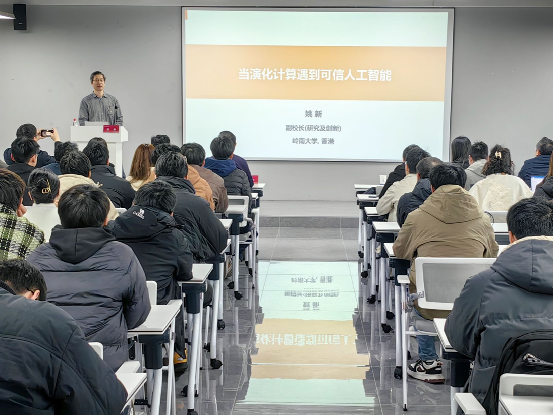 On the morning of February 20, Professor Yao Xin, Vice President of Lingnan University and a renowned expert in the field of international evolutionary computation, was invited to deliver a special lecture titled "When Evolutionary Computation Meets Trustworthy Artificial Intelligence" to faculty and students at our university. The lecture attracted nearly 200 participants from the School of Computer Science and Information Engineering, School of Software, School of Economics, School of Architecture and Art, and School of Mathematics. The event was marked by a lively atmosphere and a strong academic vibe.