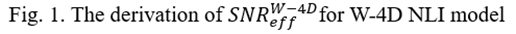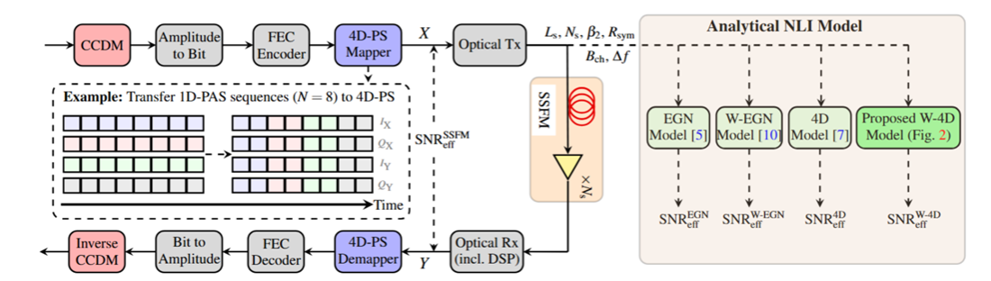 Fig. 2. Block diagram of optical transmission system with 4D-PS signal. Left: End-to-end implementation with 4D-PS encoder and decoder. The 4D-PS mapper is implemented to transfer 1D-PAS to 4D-PS. Right: SNR prediction of the considered four kinds of analytical NLI models