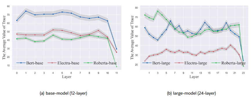 Figure 2. The average trace tr (Σ) of all sentences in different layers. Testing on the HotelReview dataset. The results are verified on three models: Bert, Electra, and Roberta
