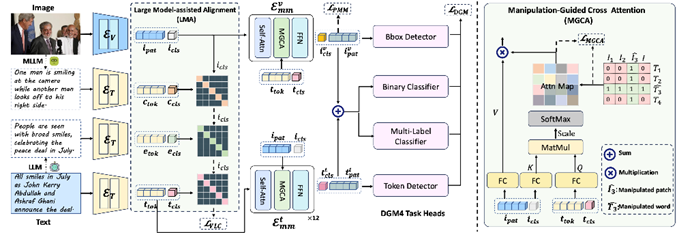 Figure 3. Illustration of our proposed ASAP framework. We employ a Multimodal Large Language Model (MLLM) to generate captions and a Large Language Model (LLM) to produce explanation texts for social media image-text pairs. These, along with the image, are encoded to obtain feature representations. Our Large Model-assisted Alignment (LMA) module enhances cross-modal alignment, followed by two Multimodal Encoders with Manipulation-Guided Cross Attention (MGCA) to integrate features for task-specific representations. One encoder is vision-biased for image grounding, and the other is text-biased for text grounding. The combined features from both encoders are used for media authenticity detection and manipulation identification. The network is optimized using DGM losses and objectives from LMA and MGCA.