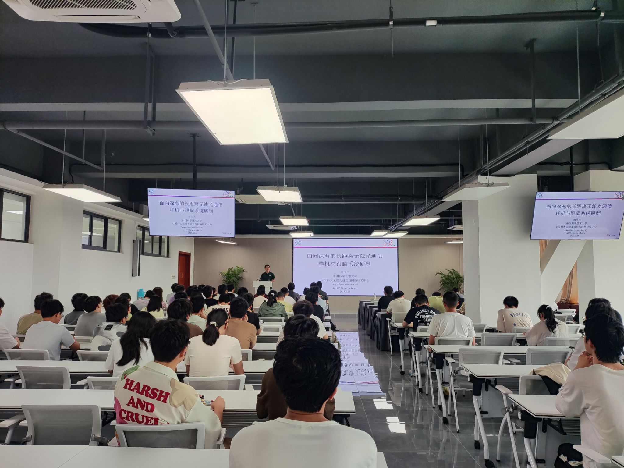 刘伟杰校友首先聚焦水下无线光强大幅度变化下的有效信号检测技术展开,针对水下环境光斑畸变特性以及低时延等要求,介绍了两种水下无线光通信跟瞄系统,利用水体光学特性等信息,提升通信链路的稳定性与可靠性。随后,刘伟杰校友介绍了目前研制样机的进展和相应的测试情况,总结了当前系统的关键技术优势和不足,并提出下一步针对提升系统鲁棒性与拓展通信距离等方面的研究计划,以助力水下无线光通信技术迈向新高度,更好地服务于空天地海一体化发展。最后,刘伟杰校友分享了自己所在团队的科研和师资情况,并诚挚邀请各位学弟学妹报考中国科学技术大学。